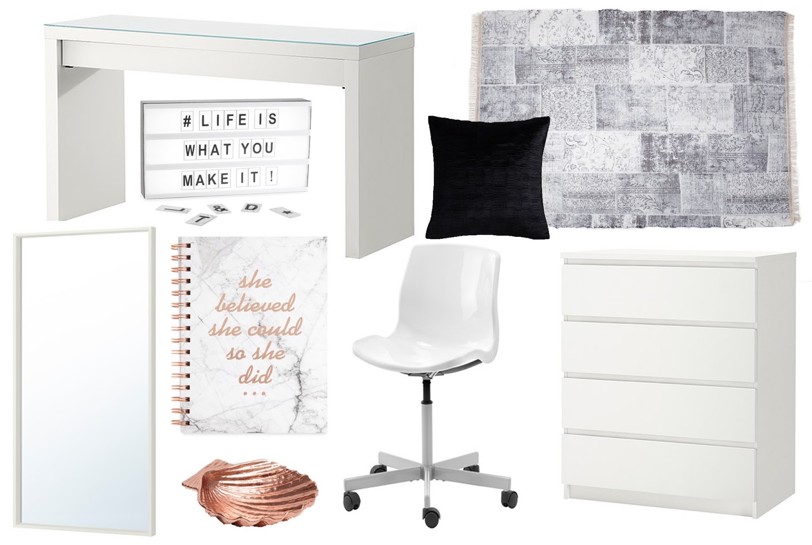 Já a pensar na próxima visita ao Continente, planeei as compras que pretendo fazer especialmente no IKEA. Para começar, o inicial passaria por uma secretária (neste caso, vou aproveitar um tocador), uma cadeira rotativa, um armário de arrumação e um espelho. Tal como referi acima, todos brancos e com linhas muito simples para que possam facilmente ser adaptados para outra divisão, caso necessário. Adorei o tapete da ZARA HOME, que quebraria ligeiramente o branco, tal como a almofada em preto. Por último apaixonei-me por alguns elementos da PRIMARK, que tenho visto no instagram. Estou desejosa de ver a colecção completa ao vivo e a cores, sei que vai ser complicado resistir.
